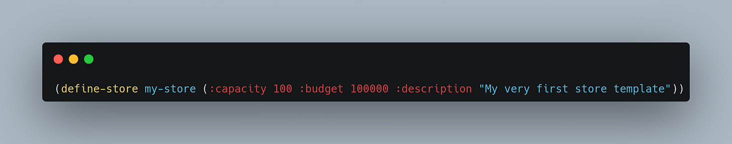 That could be equivalent to building a class named my-store, which might implicitly inherit from a store parent class. We are passing a capacity, a budget, and a description. Then, in compilation time, the define-store operator can do all the things you can imagine, maybe it is not even a class definition. The thing is, we are declaring an entity in a very clear and domain-specific way.
