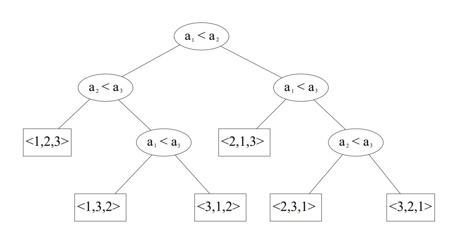 We'll represent such a comparison-based algorithm as a binary tree, where the leaves are the different permutations and every interior node represents a comparison between two specific elements of the input. Here's an example of a tree for an input of length 3.